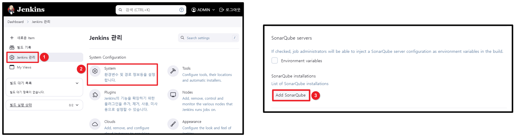 Jenkins 서버와 SonarQube 서버 간의 연동을 위해 환경 변수를 설정해줘야 한다. [그림 39]와 같이 "jenkins 관리" 페이지에서 "System"으로 이동한다. 이후, "SonarQube server" 항목에서 "Add SonarQube" 버튼을 클릭한다.