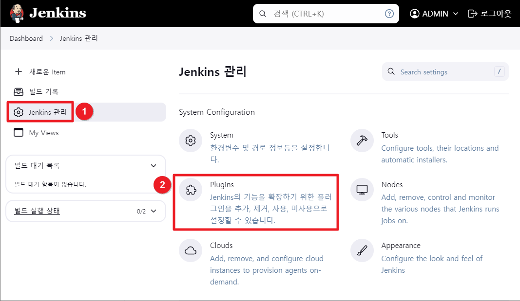 Jenkins에서 소스코드 빌드 및 SonarQube 연동을 위해서는 별도의 플러그인 설치가 필요하다. [그림 19]와 같이 "Jenkins 관리" 페이지로 이동한 뒤, "플러그인 관리" 버튼을 클릭한다.