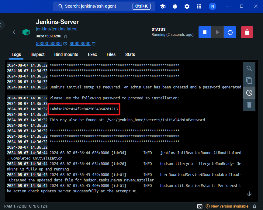 "Administrator password"는 실행된 컨테이너의 "Logs" 항목에서 확인할 수 있으며, 최초 한 번만 입력하면 된다.