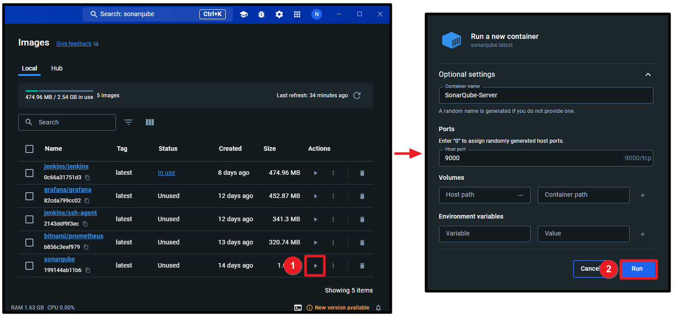 다운로드한 "sonarqube" 이미지를 선택한 후, [그림 17]과 같이 실행 버튼을 클릭하고 구성 설정을 완료환 뒤, "Run" 버튼을 클릭한다.