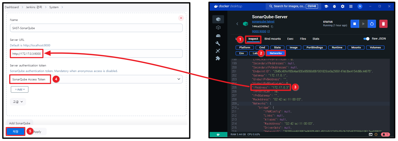 설정에서 SonarQube 서버 주소를 입력할 때, Docker 컨테이너의 내부 IP 주소를 사용해야 한다. 이 주소는 [그림 40]에서 SonarQube 컨테이너의 정보를 통해 확인할 수 있다. "Server authentication token" 필드에는 [그림 38]에서 생성한 크리덴셜을 선택하면 된다.