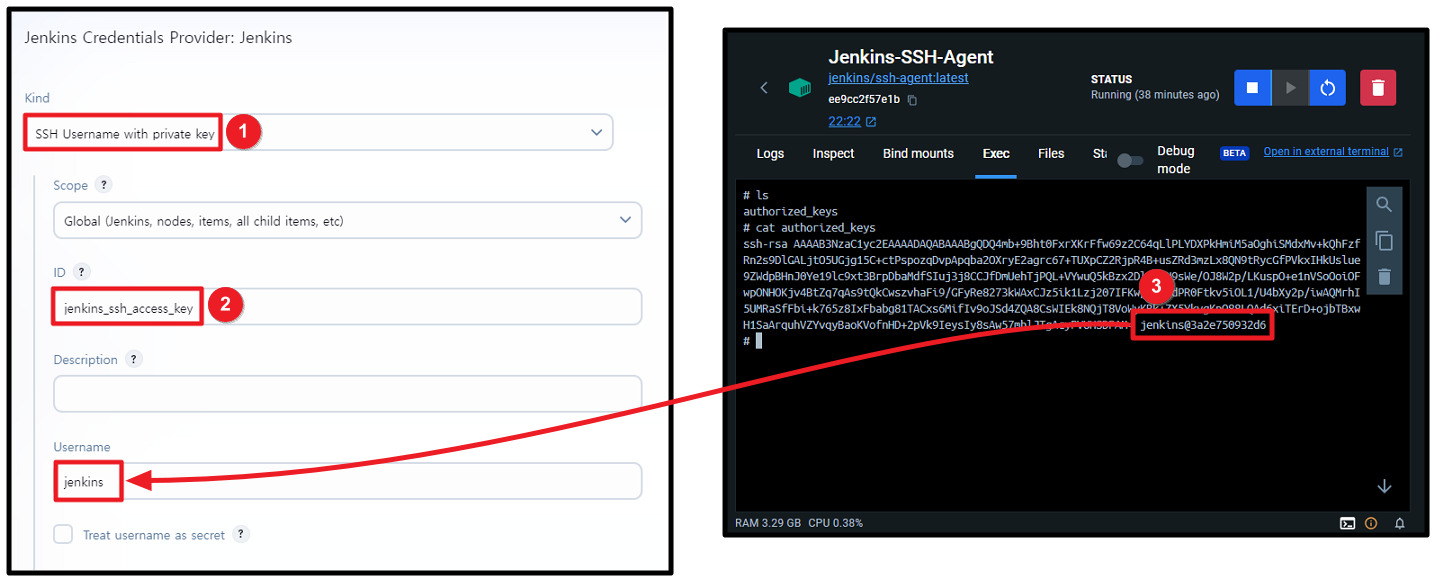 ① "Kind" 항목에서는 SSH 공개키 기반 인증을 위해 "SSH Username with private key"를 선택한다. ② "ID"는 임의의 값을 지정한다. ③ "Username"에는 [그림 48]에서 생성했던 SSH 공개키의 소유자 정보를 입력한다.