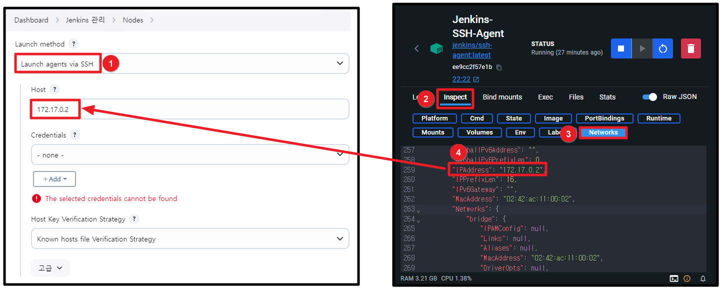 다음으로, "Launch method" 항목에서 "Launch agents via SSH"를 선택한다. "Host" 값에는 SSH Agent 서버의 컨터이네 내부 IP 주소를 기입한다.