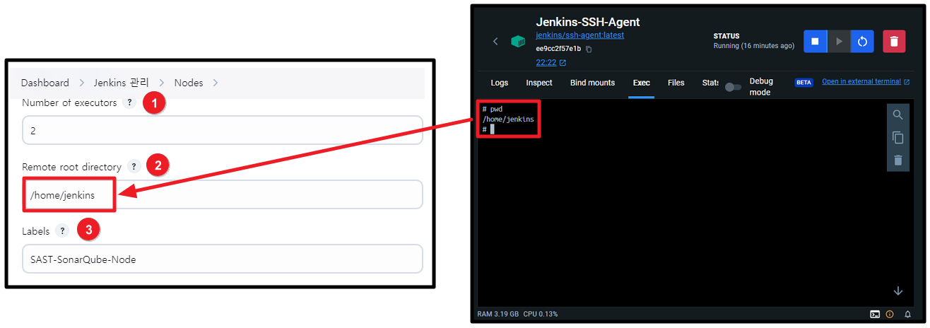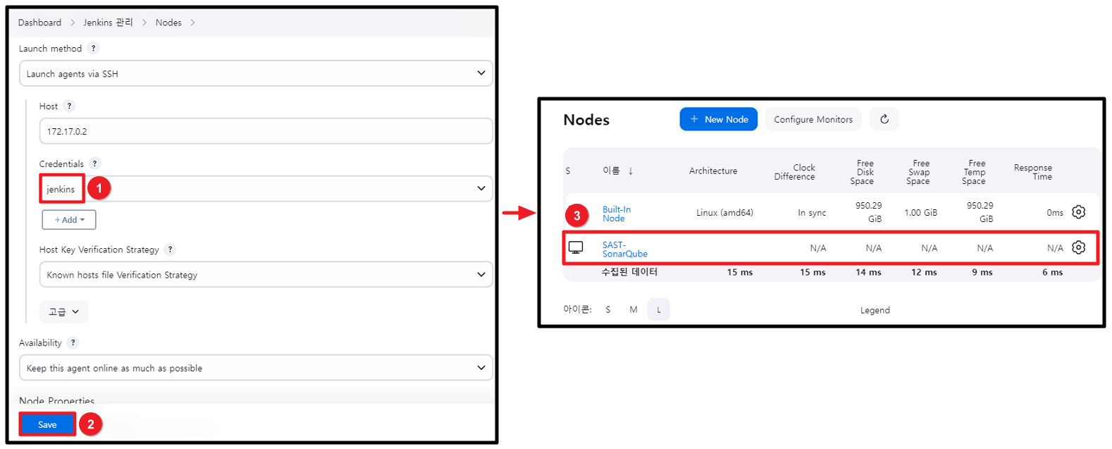 ① "Number of executors"는 Jenkins가 동시에 수행할 수 있는 최대 빌드 수를 지정하는 항목으로, 개인 PC의 사양에 따라 값을 설정하면 된다. ② "Remote root directory" 항목에는 에이전트의 홈 디렉토리를 지정해준다. 이 디렉토리를 기준으로 SSH 접근 키 등의 파일을 탐색하게 된다. ③ "Labels"는 해당 노드를 식별하는 데 사용되는 명칭으로, SonarQube에서 이 노드를 호출할 때 사용된다.