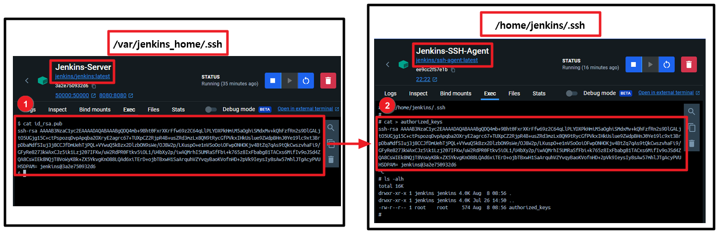 Jenkins 서버에서 생성한 SSH 공개 키를 복사한 후, SSH Agent 서버에서 cat 명령어를 사용하여 해당 키를 authorized_keys 파일에 추가한다. 이제, Jenkins 서버와 SSH Agent 서버 간에 SSH 키를 통한 원격 접속이 가능해진다.
