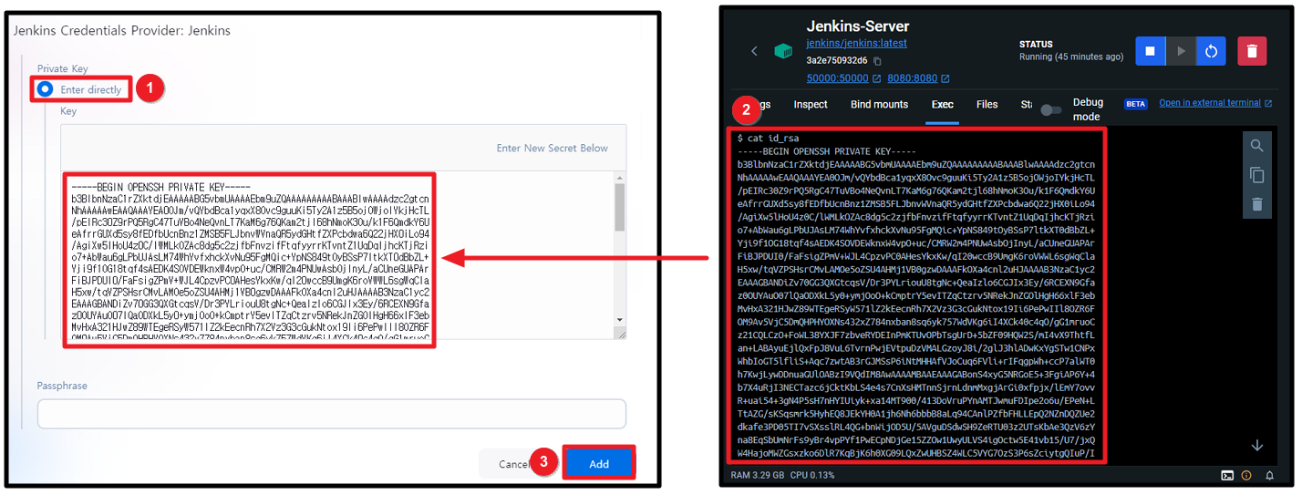 "Private Key" 항목에서 "Enter directly"를 선택한다. 이 항목은 SSH 공개키 인증을 위한 개인키를 등록하는 곳으로 Jenkins 서버에서 생성한 SSH 개인키 파일인 id_rsa의 내용을 입력해주면 된다.