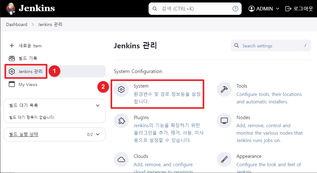 생성한 공유 라이브러리를 Jenkins에서 불러올 수 있도록 설정을 해주겠다. 해당 설정은 "Jenkins" 관리의 "System" 항목에서 할 수 있다.