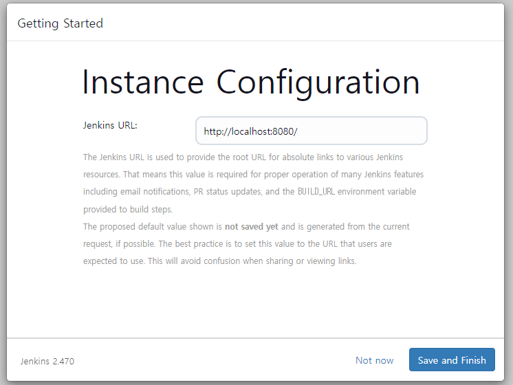 마지막으로 Jenkins Root URL을 설정하면, Jenkins 설치 및 구성 과정이 완료된다.