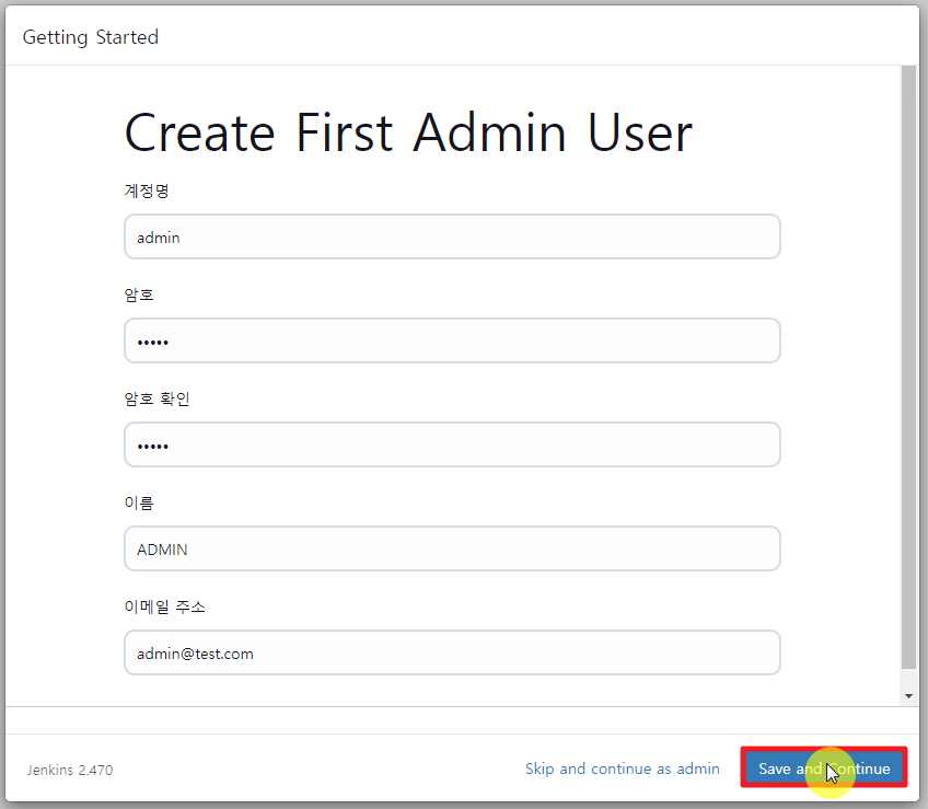 플러그인 설치가 완료되면, [그림 14]과 같이 관리자 계정 생성 페이지로 이동한다. 입력 폼에 필요한 정보를 기입한 후, "Save and Continue" 버튼을 클릭하여 계정을 생성한다.