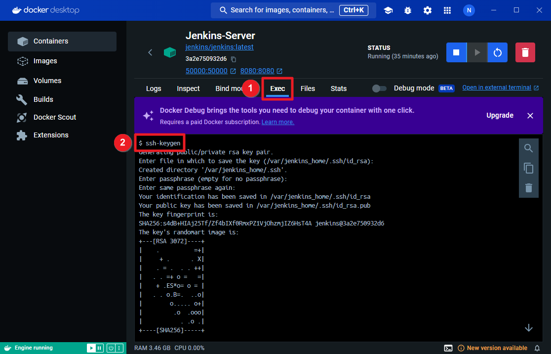 SSH Agent를 사용하여 Jenkins 서버에 원격으로 접속하기 위해서는 Jenkins 서버의 SSH 공개 키를 발급받아야 한다. 우선, [그림 47]과 같이 "Docker Desktop"에서 Jenkins 서버 컨테이너를 선택해준다. 이후 "Exec" 항목을 클릭하여 해당 컨테이너의 쉘을 활성화한 후, ssh-keygen 명령어를 입력한다. 이 명령어는 SSH 공개 키와 개인 키를 생성하는데 사용된다.