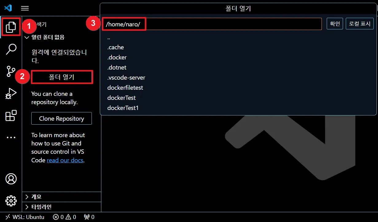 4. 리눅스 서버와 정상적으로 연결되면, [그림 10]과 같이 VSCode의 "폴더 열기" 기능을 사용하여 원하는 작업 디렉터리로 이동하면 된다.