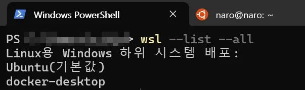 1. 먼저, 터미널에서 아래 명령어를 입력하여 WSL에 설치된 배포 이미지를 확인한다. 이때, Ubuntu 외 다른 이미지에 "기본값"이 설정되어 있다면, 이를 변경해야 한다.