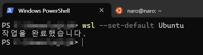2. 아래의 명령어를 통해 설치된 "Ubuntu" 서버를 기본 배포판으로 설정해준다.