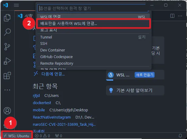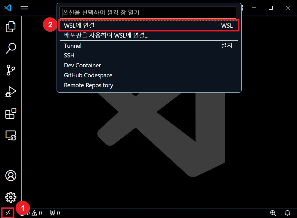 3. 두 번째 방법은 터미널을 사용하지 않고 VSCode에서 직접 연결하는 방법이다. ① VSCode 하단에 있는 원격 연결 아이콘을 클릭한다. ② "WSL에 연결" 옵션을 선택한다.