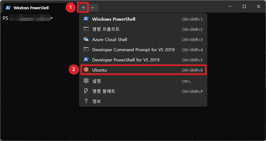 4.1 설치한 Windows Terminal을 실행한 다음에 [그림 4]와 같이 상단의 "+" 아이콘을 클릭한다. 이후, 디폴트 옵션으로 설치된 Ubuntu를 선택해주고 사용자 계정을 생성해주면 된다.