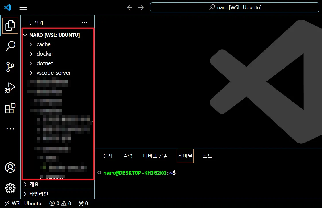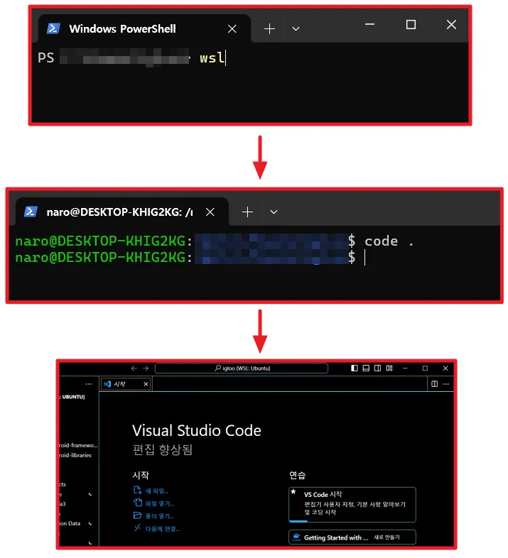 2. 이후, VSCode에서 WSL을 연동하는 방법은 두 가지로 나눌 수 있다. 첫 번째 방법은 [그림 8]과 같이 터미널을 통해 WSL에서 설치된 리눅스 배포 서버에 먼저 접속한 후, 작업하고자 하는 디렉터리 위치에서 "code ." 명령어를 입력하는 것이다.