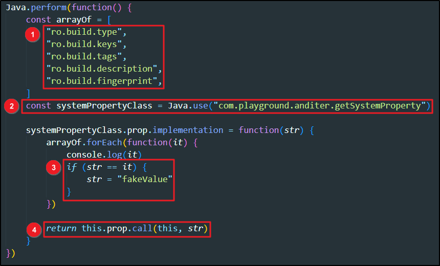 [그림 5]는 systemPropertyClass의 prop() 함수를 후킹하기 위해 필자가 작성한 Frida 스크립트이다. 코드를 보면 ① isCheckRootingKeys() 함수에서 prop() 함수 호출 시 전달 했던 시스템 속성을 그대로 가져와 리스트로 선언했고 ②에서는 prop() 함수 사용을 위해 getSystemProperty 클래스 객체를 반환 받았다. ③ 에서는 prop() 함수로 들어오는 매개 변숫값이 ①에서 선언한 리스트에 포함되어 있을 경우 더미 값으로 변조하고 ④ 변조한 더미 값을 인수로 원본 prop 함수를 호출해 결괏값을 반환한다