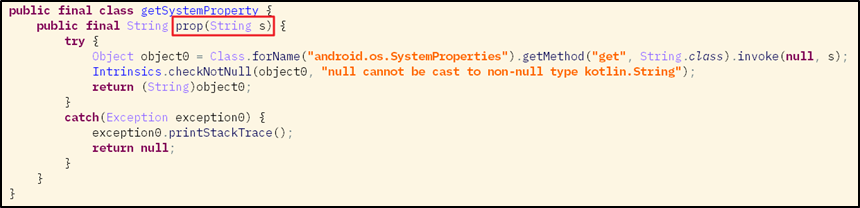 isCheckRootingKeys() 함수에서 사용된 getSystemProperty 클래스를 살펴보면 prop() 함수 하나만 존재하고 있고, 매개 변수로 받은 문자열은 Class 클래스를 통해 로드된 클래스의 함수 매개 변숫값으로 사용되며 해당하는 시스템 속성 값을 반환한다