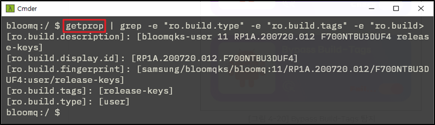 일반적으로 바뀌는 시스템 속성 값은 ro.build.type, ro.build.tags, ro.build.display.id, ro.build.description, ro.build.fingerprint 등이 있으며, 디바이스 콘솔에서 getprop 명령어를 통해 확인이 가능하다.