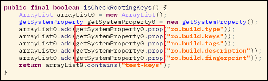 [그림 3]의 isCheckRootingKeys() 함수는 Bypass Module 탐지 결과를 반환해 주는 역할을 한다. 코드를 살펴보면 위에서 언급한 시스템 속성 값인 ro.build.type, ro.build.keys 등이 getSystemProperty 클래스의 prop() 함수 호출 시 인수 값으로 사용되고 있으며, 결과 반환 값은 arrayList0 리스트 변수에 저장된다. 그 후 contains() 함수를 통해 반환 값 중 test-keys 와 일치하는 문자열이 있는지 검사하게 된다.