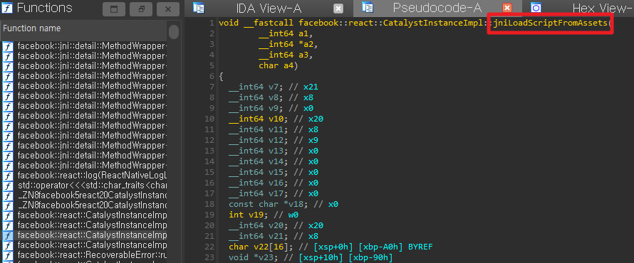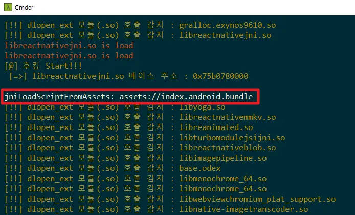 따라서, 바로 Frida를 사용해 libreactnativejni.so 라이브러리에서 호출되는 jniLoadScriptFromAssets 함수의 offset 값을 확인하면 된다.