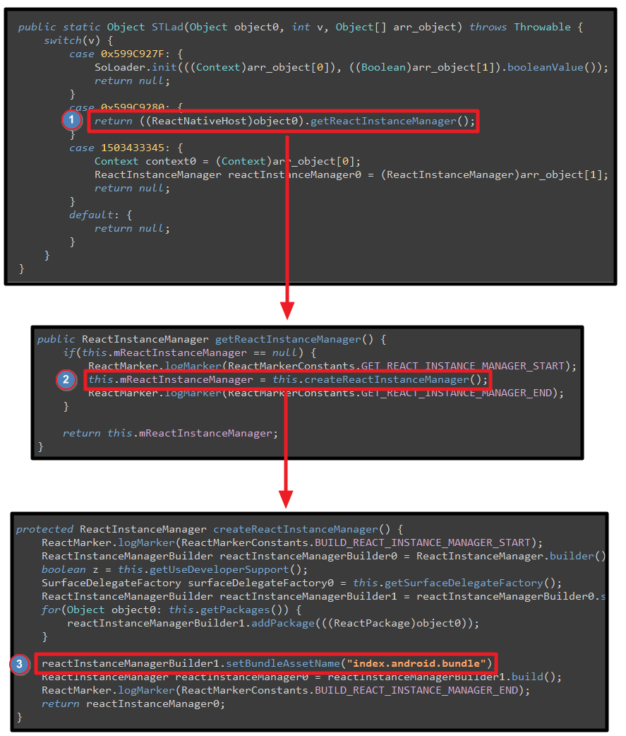 먼저, index.android.bundle 파일을 변조하기 앞서 소스코드에서 번들 파일을 어떠한 함수가 로드하고 그 함수는 어디서 호출되고 있는지 확인이 필요한데 이 과정은 우리가 [그림 12]에서 확인한 바 있다.(라이브러리 이름, 함수 이름)