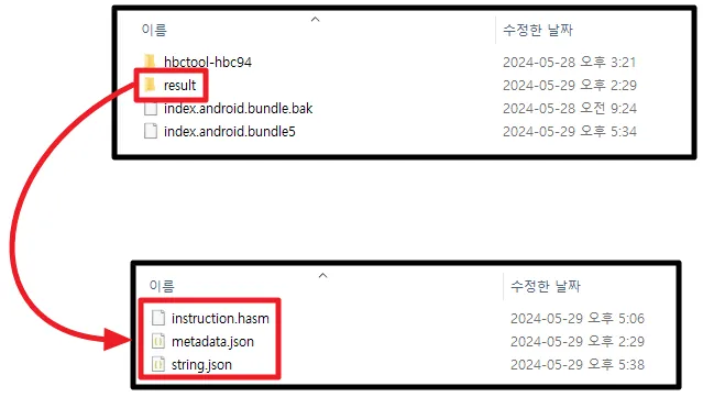 컴파일은 디컴파일 후 산출된 3개의 파일이 위치한 디렉터리 경로를 인자로 전달해주면 된다. 여기서 중요한 건 반드시 3개의 파일이 하나의 디렉터리에 위치해 있어야 한다. 이후, index.android.bundle 파일을 기존 파일과 교체 후 APK 리패키징을 하면 된다.
