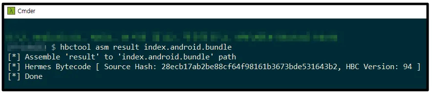 코드 변조 후 다시 HbcTool을 사용해 번들 파일로 컴파일 해준다.