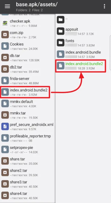 디바이스에서 APK 관리 도구(NP Manager, Lucky Patcher, APK Editor Pro 등)를 활용하여 /data/local/tmp 경로에 복사한 번들 파일을 앱 실행 파일(APK)의 assets/ 경로로 이동시킨다.