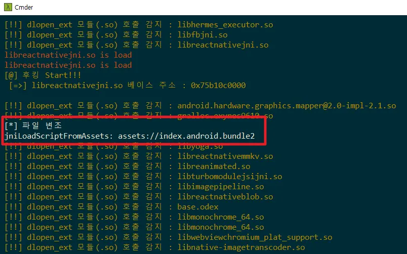 그리고 [그림 30]을 보면 앱을 실행할 때, 변조된 번들 파일이 로드되는 것을 확인할 수 있다.
