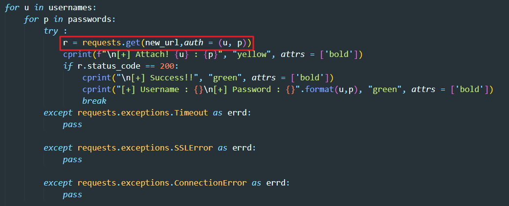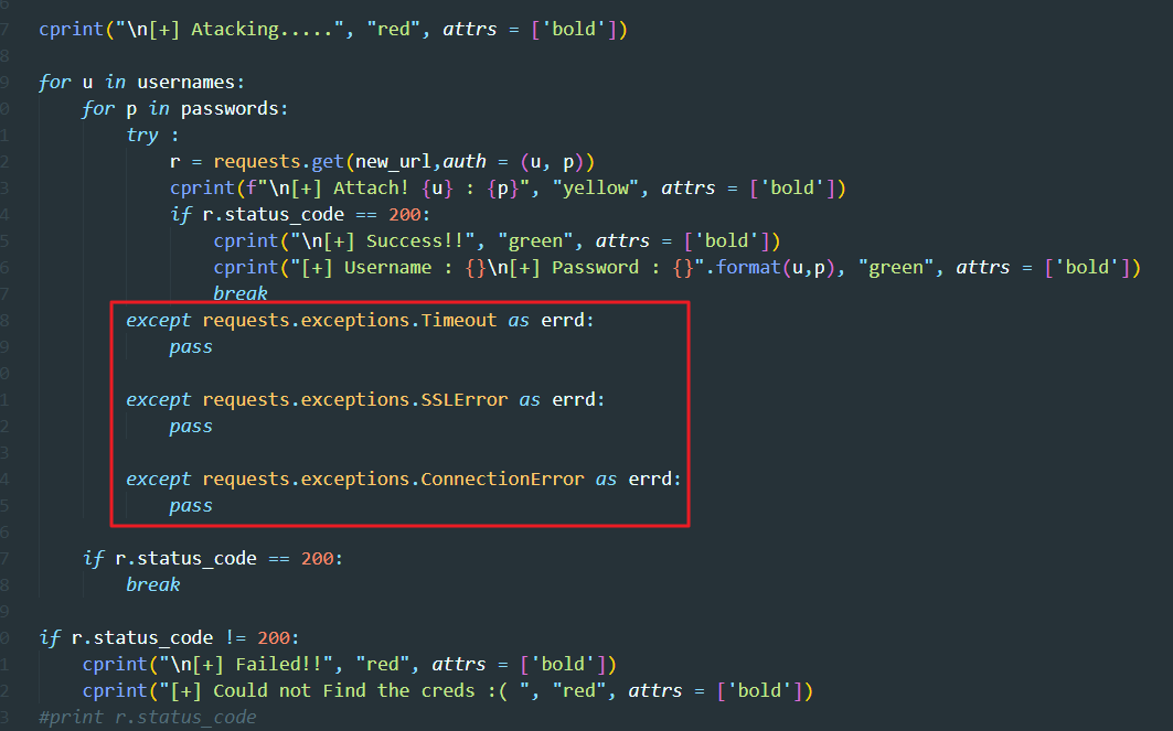 [그림 1]의 코드는 Tomcat-Manager-Bruteforce 코드 중 일부로 사용자에게 계정명 및 패스워드 사전 파일을 인자로 받아 Tomcat 관리 페이지 무작위 로그인을 시도한다. 그러나 사용하다보니 상황에 따라서, 응답 시간 초과, SSLError 관련 오류가 발생하기도 해서 [그림 1]의 박스와 같이 별도의 예외 처리를 추가했다.