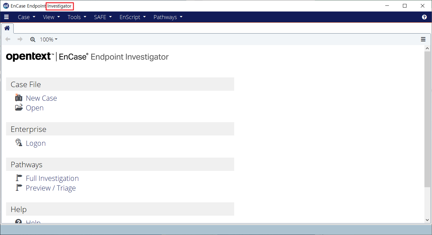 라이센스가 정상 등록되었다면 [그림 4]와 같이 프로그램 상단에 버전에 따른 특정 문자열이 출력되는데 필자의 경우는 "Investigator"로 표시된다. 그런데 출력되는 문자열이 "Acquisition"로 표시된다면 이는 라이센스가 등록되지 않았다는 것으로 다시 라이센스 등록 과정 진행해줘야 한다. 때문에, EnCase 실행 후 꼭 상단에 표시되는 문자열을 보고 라이센스가 등록되었는지 확인해야 한다.