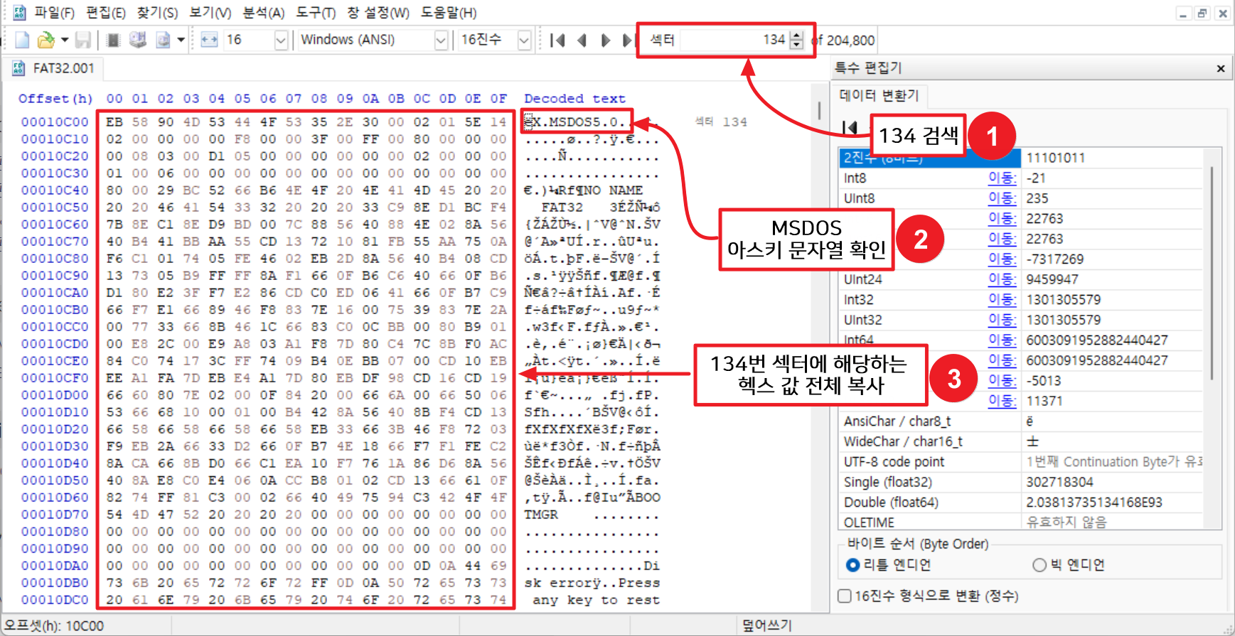 ① 134번 섹터로 이동하면 ② "MSDOS5.0" 아스키 값을 통해 FAT32 이미지의 부트 레코 백업 데이터가 저장되어 있는 것을 확인할 수 있다. ③ 복구를 위해 해당 섹터의 헥스 값을 전체 복사한다.
