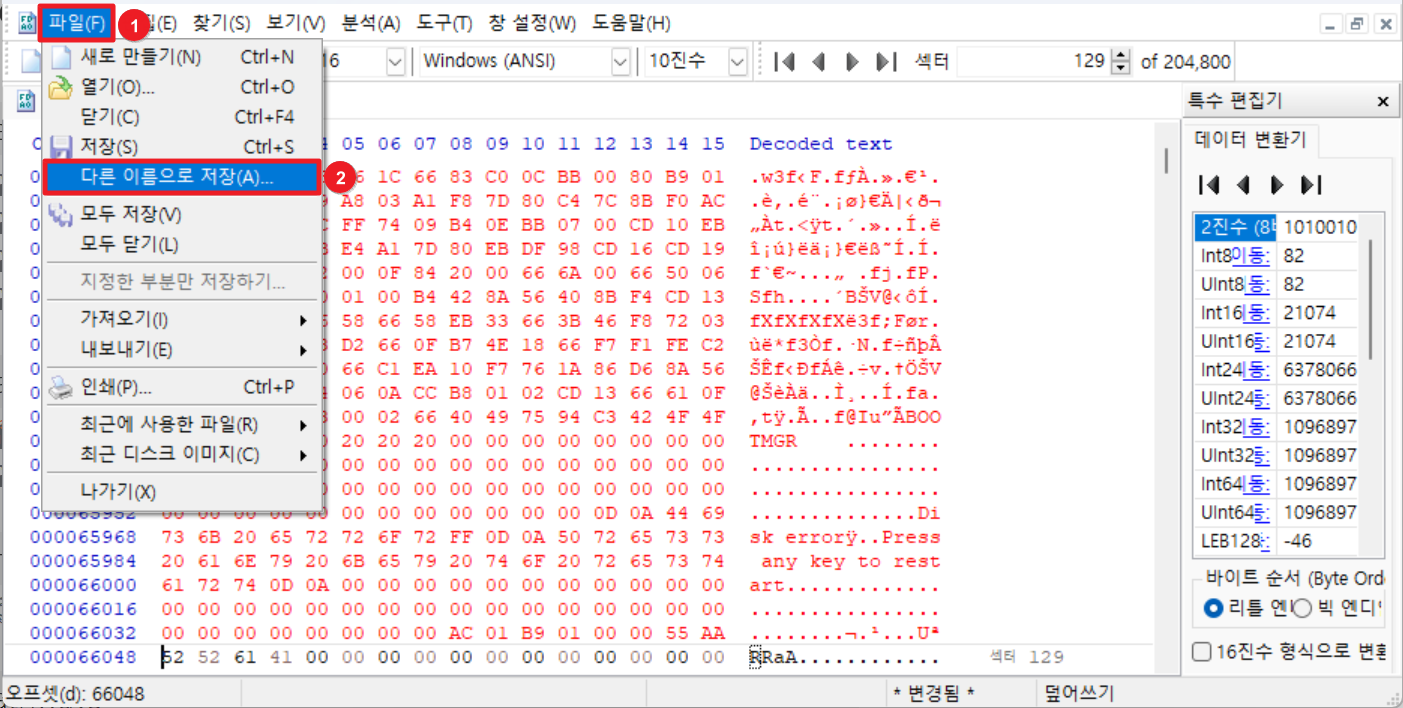 ① 상단의 [파일] 탭을 클릭 후 ② "다른 이름으로 저장" 버튼을 클릭하여 복구한 이미지를 저장해준다.