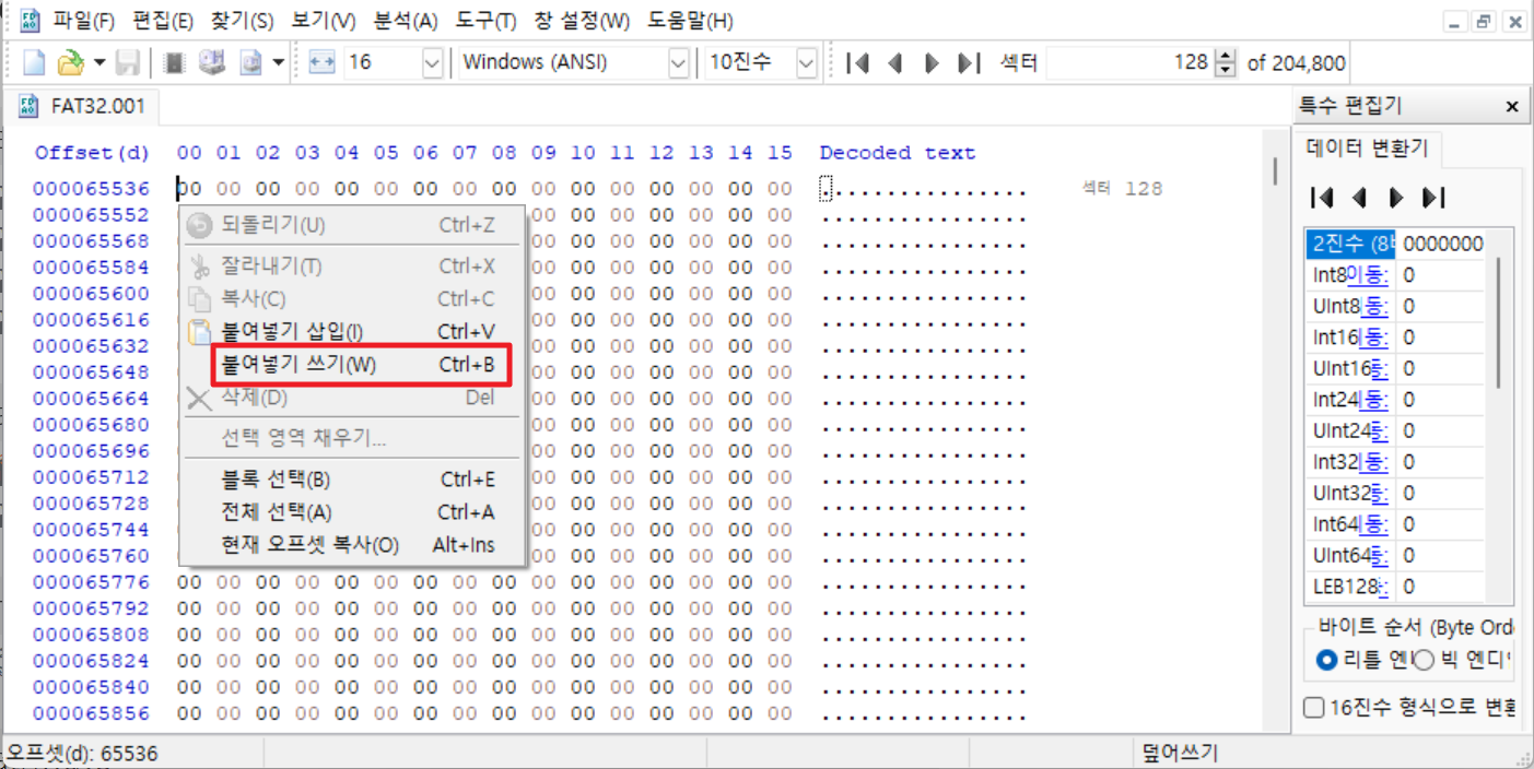 첫 번재 파티션의 시작 섹터인 128번 섹터로 돌아와 섹터의 시작 부분에서 마우스 오른쪽을 클릭하고 "붙여넣기 쓰기"를 클릭해준다. 이때, 주의할 점은 붙여넣기 쓰기가 아닌 삽입을 하게 될 경우 데이터를 128번 섹터가 아닌 새로운 섹터를 생성하여 데이터를 쓰기 때문에 반드시 "붙여넣기 쓰기"를 해줘야 한다.