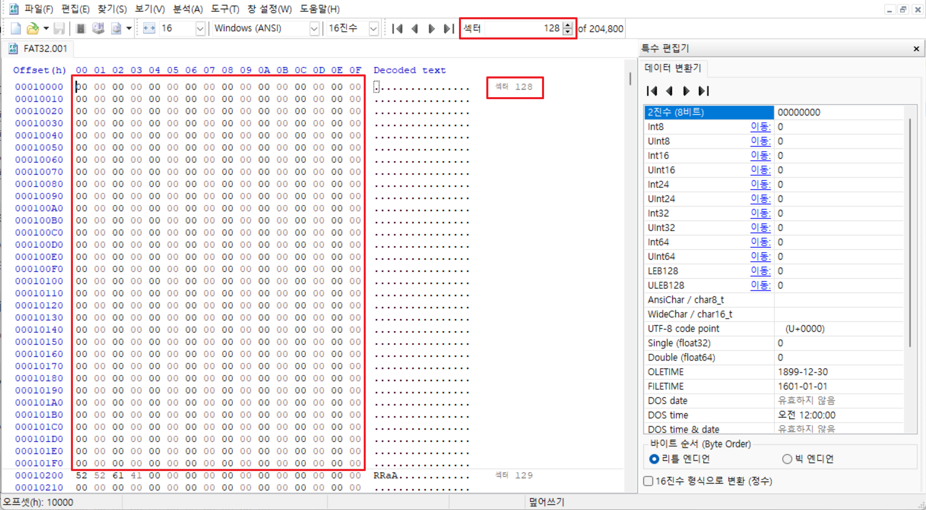 [그림 7]에서 확인한 첫 번째 파티션의 시작 섹터인 128번으로 오면 [그림 8]과 같이 해당 섹어틔 데이터가 모두 비워져있는 것을 볼 수 있으며, 이와 같은 이유로 FTK Imager에서 이미지 정보를 불러오지 못하는 것이다.