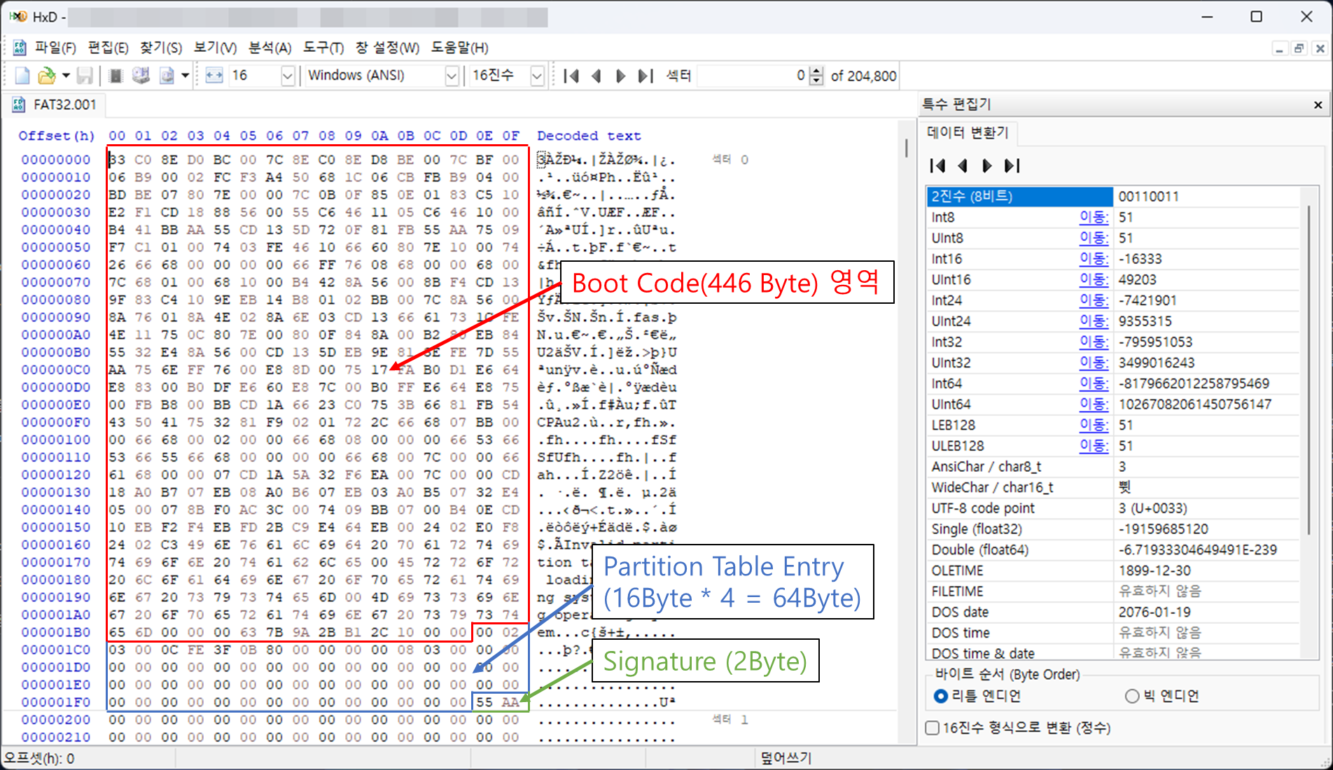 디스크 0번 섹터에는 MBR(Master Boot Recoder) 또는 BR(Boot Recoder)가 존재하며, 0번 섹터가 MBR인지 BR인지에 따라 접근 방법이 달라진다. 여기서는 MBR로 판단하고 분석을 진행하겠다. (실제로 MBR이다.)