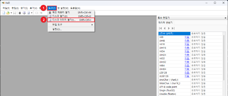 dd 타입의 이미지를 생성했다면, HxD 프로그램을 실행한 후 [도구 - 디스크 이미지 열기]를 통해 생성한 이미지를 불러온다.